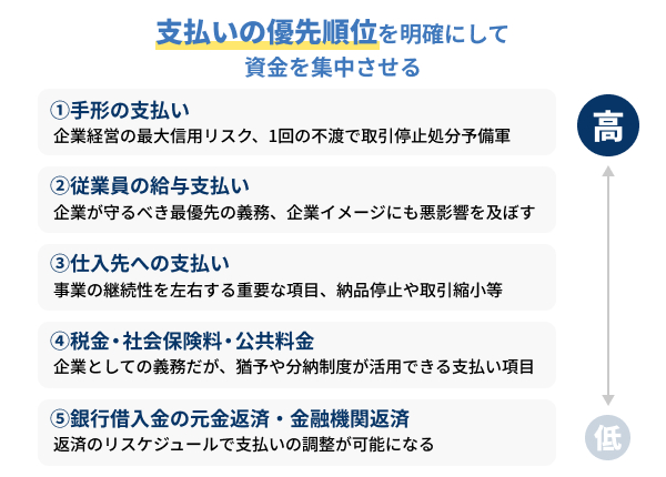 そこで重要なのが、支払いの優先順位を明確にして資金を集中させることです。支払先の中でも、企業活動や信用維持に直結する項目を優先することで、短期的な経営危機を回避できます。